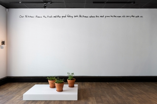 The exhibition features diverse works by local, national and international artists, in and outside the Untitled Art Society main gallery space, online, in the UAS +15 Vitrine and on billboards across the city. In the gallery: Rana Bishara's photographic installation of robust cacti growing in the West Bank provides a bird's-eye view of colonial occupation in the background; Christina Battle offers visitors seeds harvested from her Southwestern Ontario garden accompanied by semi-instructional zines to take away; sisters Richelle Bear Hat and Brittney Bear Hat present a collaborative installation with mint tea gathered from their ancestral territory along with personal stories; Abdi Osman's video projection of a woman reminiscing on the shoreline recalls the ways in which bodies, like plants, have been forcefully transposed across bodies of waters; and commissioned writing by scholar Rinaldo Walcott responds to these collective works, and is presented in the form of a textual installation.